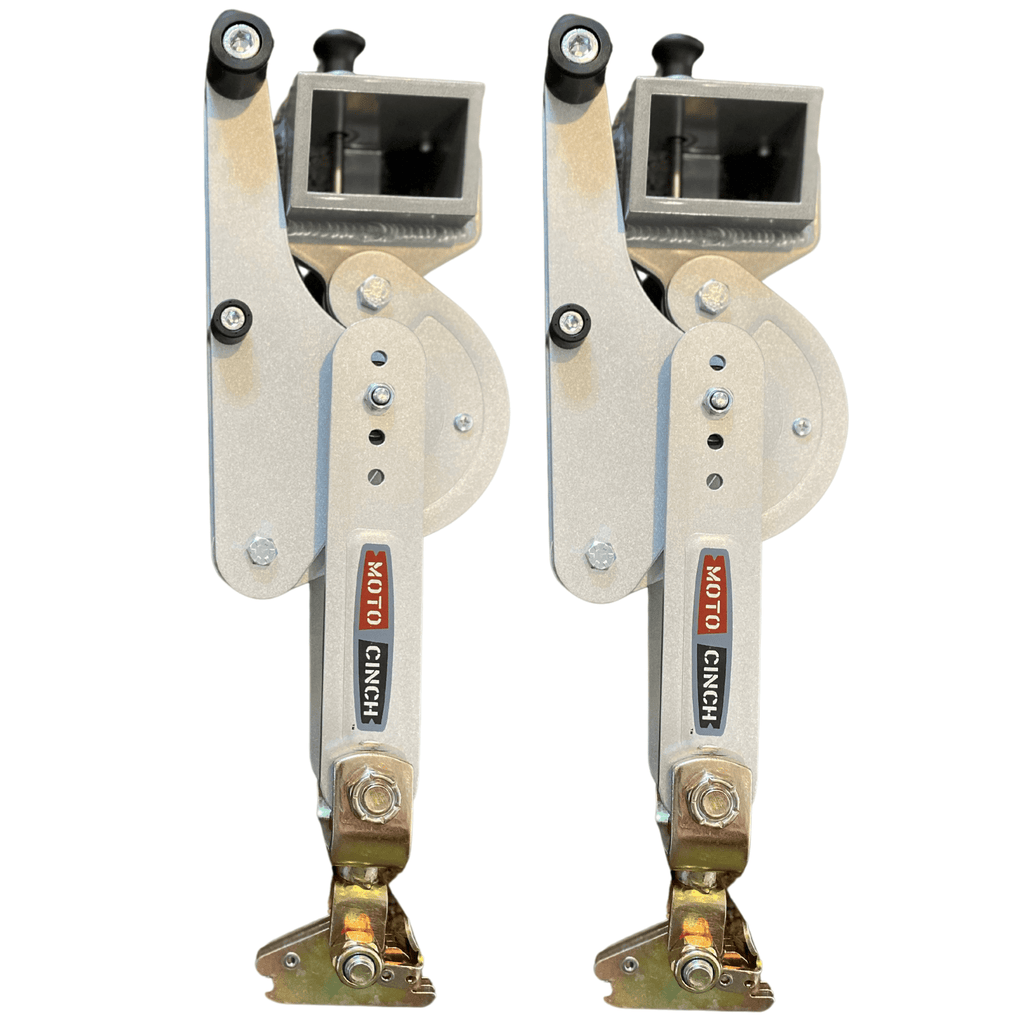 New for 2022!  We now have the popular Moto Cinch MX with E-Track mounts. These are SUPER strong and can be use on both vertical and horizontal E-Track systems thanks to our unique swivel base.  Base model is zinc coated, silver powder coated model is also available.  PLEASE MAKE SURE YOU ARE NOT WANTING L-TRACK!  Minimum peg height is 14.5” ground to top of pegs.